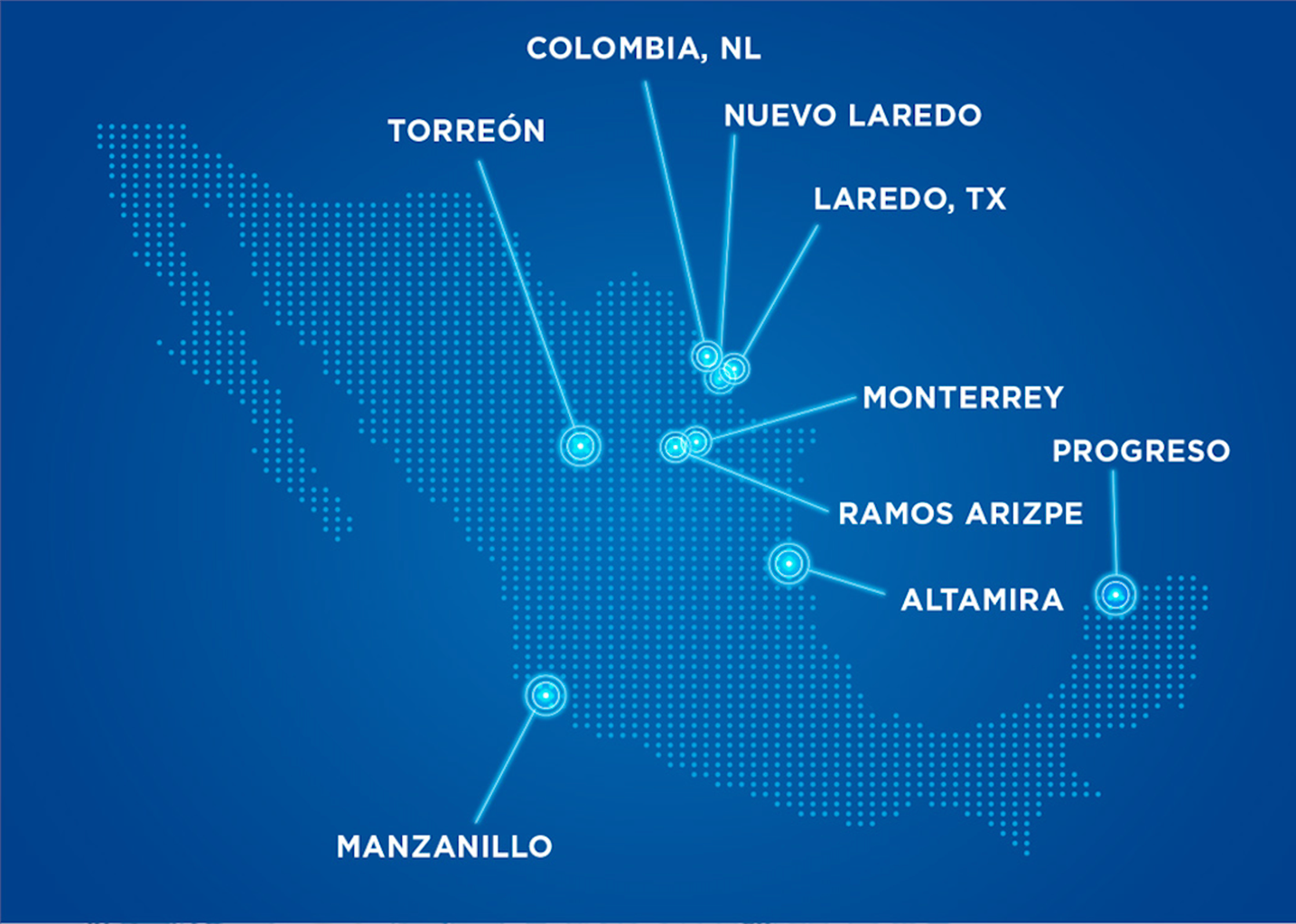 Contamos con almacenes y centros estratégicamente ubicados cerca de puntos fronterizos y puertos clave entre México y Estados Unidos, lo que nos permite minimizar tiempos de espera y agilizar el flujo de mercancías.